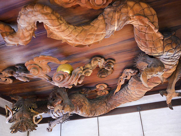 拝殿の天井には見事な木彫りの龍が祀られ、