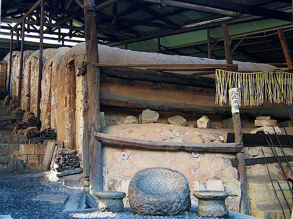 囲炉裏のある広間、残された大きな登り窯。