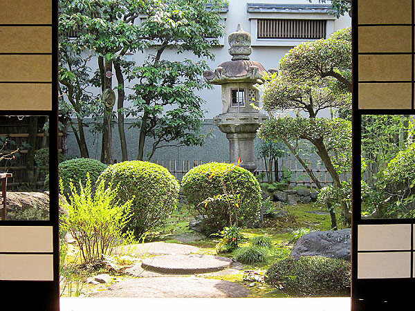 雪見障子の茶室。苔むした露地。