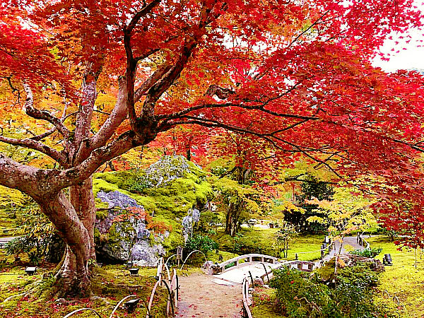 艷やかな苔の緑に、燃えるような紅葉。