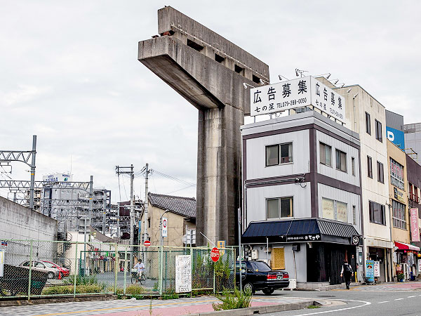 店舗に突き刺さる巨大橋脚群。