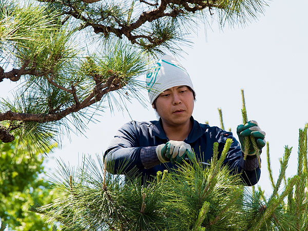 嘉永元年(1848)創業、植彌加藤造園の職人。御用達として東本願寺・渉成園の担当を務める。京都の景色に欠かせない東山の林相改善事業の整備や研究も行っている。いきもの全般が大好きで、生物多様性に配慮して渉成園の育成管理に励む。自然界にあるものは「とりあえず何でも食べてみる」主義。