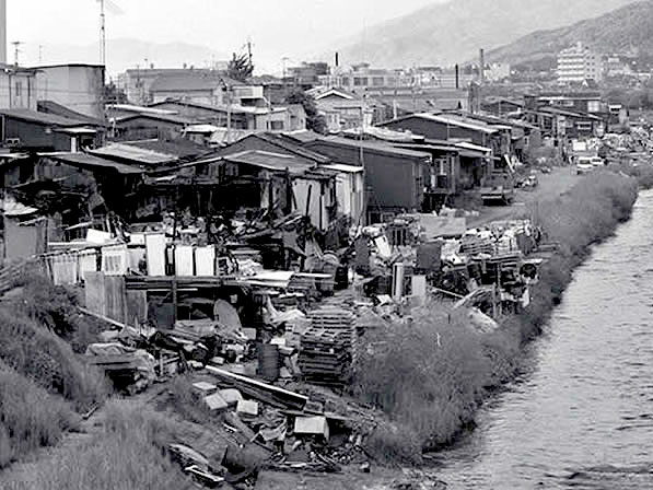 バラックが建ち並び、