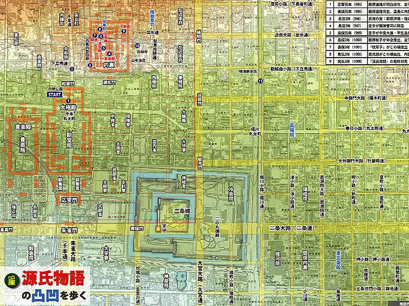 【距離:3.1km】市バス「千本丸太町」 → 1.内野公園(大極殿遺阯碑) → 2.大極殿跡 → 3.内裏内郭回廊跡 → 4.紫宸殿跡 → 5.清涼殿跡 → 6.藤壺(飛香舎)跡 → 7.弘徽殿跡 → 8.登華殿跡 → 9.淑景舎(桐壺)跡 → 10.職御曹司跡 → 11.陽明門跡 → (解散)