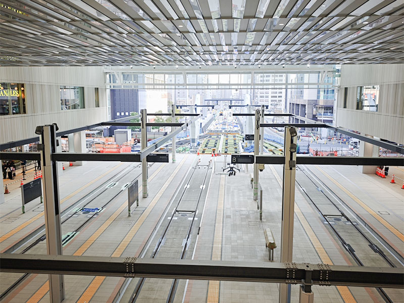 広島駅2階に路面電車が乗り入れ。