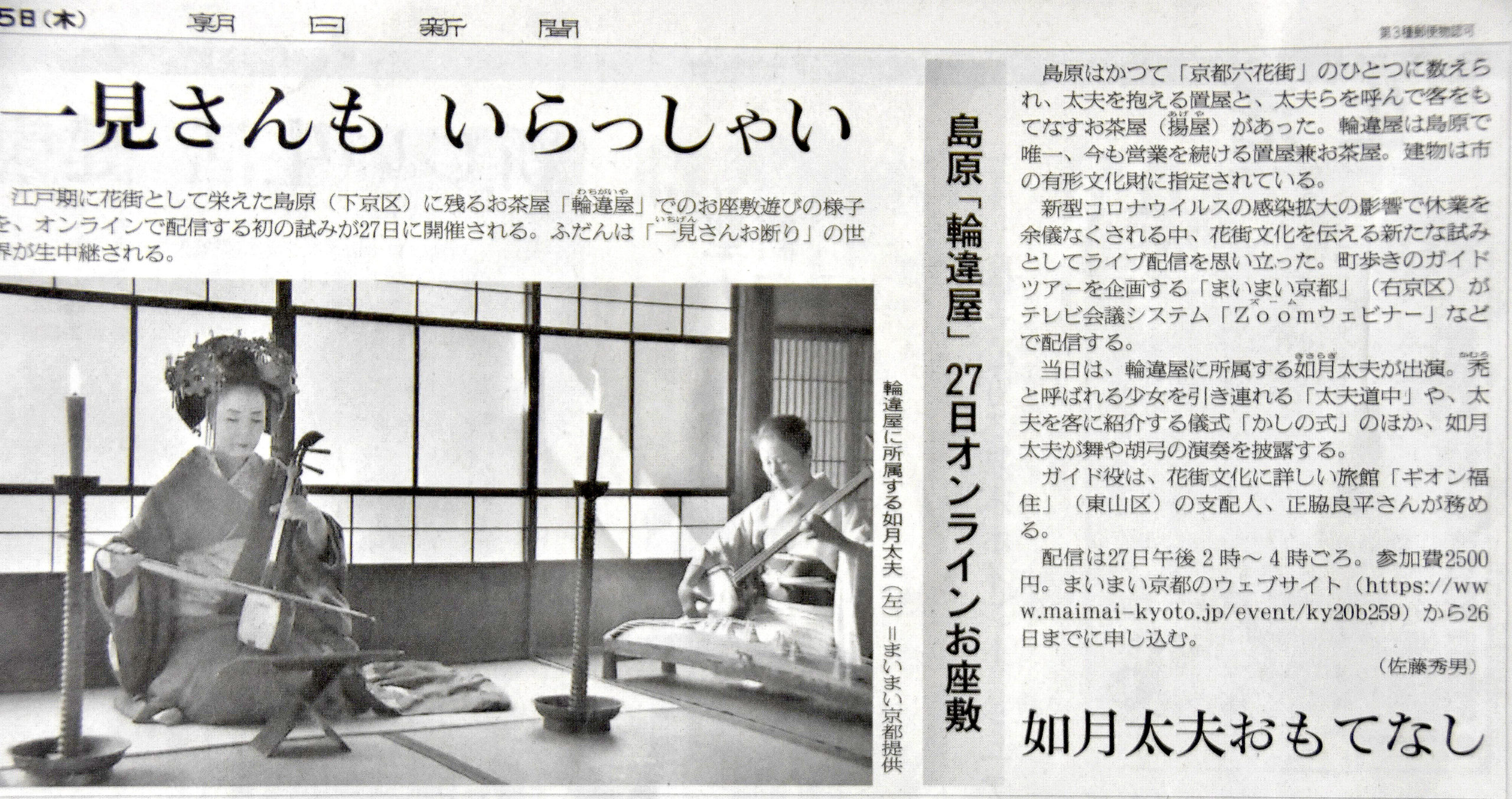 朝日新聞に掲載されました。 紹介いただいた輪違屋オンラインお座敷はこちら
