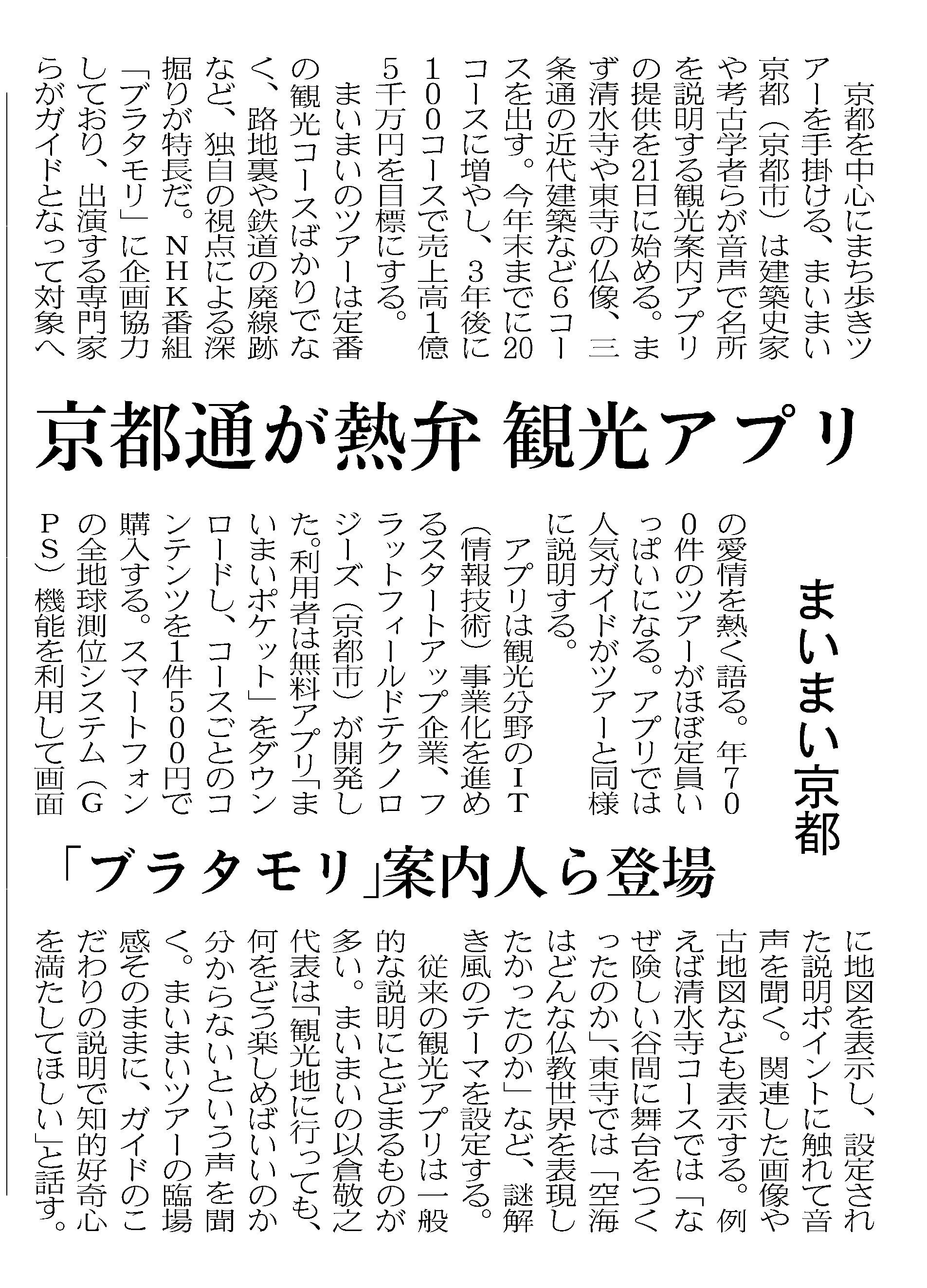 日経新聞に掲載されました。 京都通が熱弁、観光アプリ まいまい京都が提供開始